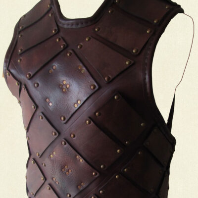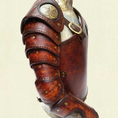 Created from two layers of 3mm thick vegetable tanned leather which have been moulded and dyed by hand and given a textured appearance. Finished with antiqued brass buckles and hand stitched edging. This piece has an extra panel for added flexibility and coverage when worn with a Hero Belt