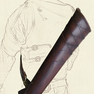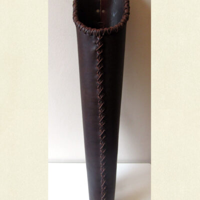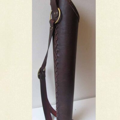 This piece includes a bow sheath, a quiver, an axe scabbard and buckled straps for the option of attaching a bed roll.