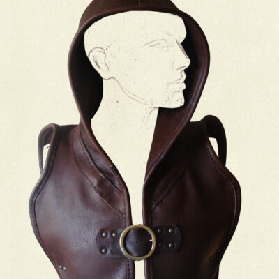 The battle cowl / hood is hand crafted from high quality 2.5mm thick textured wax coated leather with solid brass buckles and fittings and hand stitched reinforced edges.