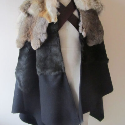 The fur mantle is hand crafted from rabbit fur pelts with 2.5mm thick wax coated brown leather lining and hand stitched edging. It fastens with a heavy 2” solid brass buckle.