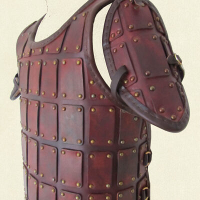 Created from two layers of 3mm thick vegetable tanned leather which have been moulded and dyed by hand and given a textured appearance. Finished with antiqued brass buckles and hand stitched edging. This piece has an extra panel for added flexibility and coverage when worn with a Hero Belt