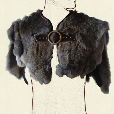 The fur mantle is hand crafted from rabbit fur pelts with 2.5mm thick wax coated brown leather lining and hand stitched edging. It fastens with a heavy 2” solid brass buckle.