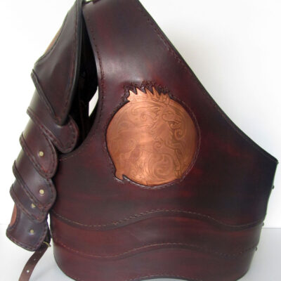 The streamlined armour is made up of segmented panels from shoulder to vambrace which features a moulded elbow. All finished with hand stitched edging and featuring a high quality acid etched copper plate design, which is inlaid and hand stitched.